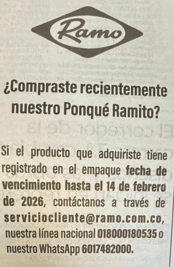 Productos Ramo anuncia la recolección voluntaria de los ponqués Ramito en el mercado colombiano, una decisión que se comunica oficialmente este martes 27 de enero de 2026. La medida aplica para las unidades con fecha de vencimiento hasta el 14 de febrero de 2026, mientras la compañía adelanta verificaciones técnicas internas sobre el producto.